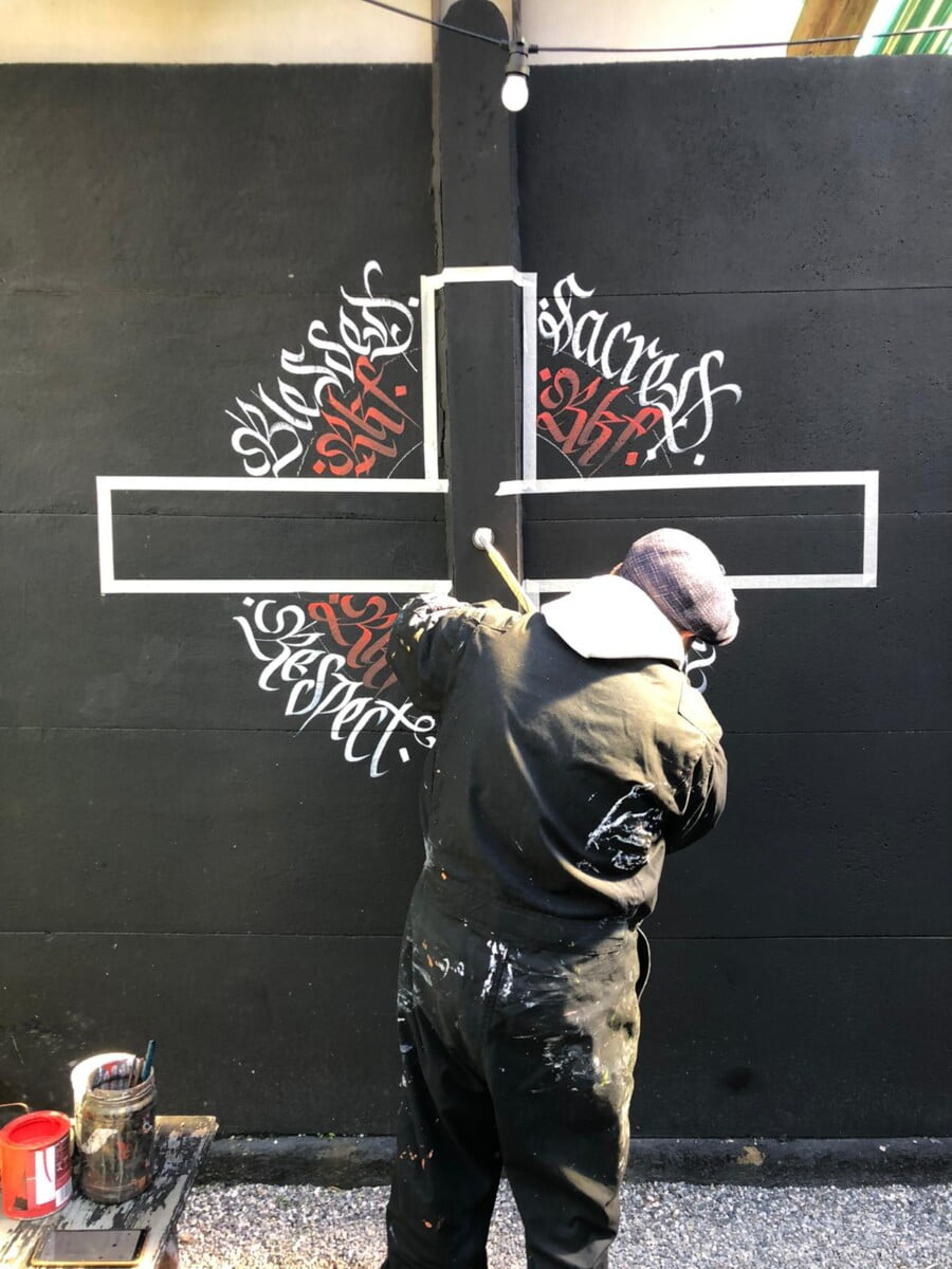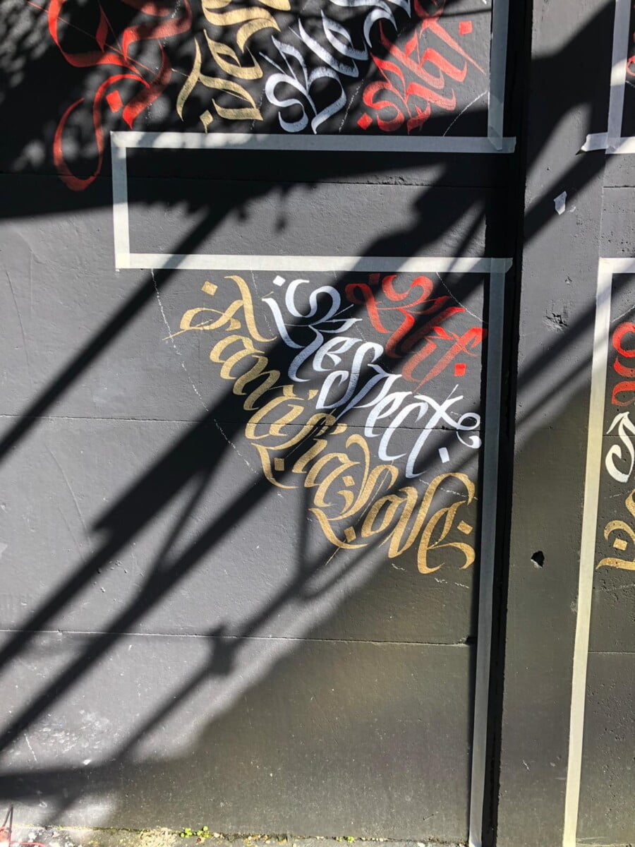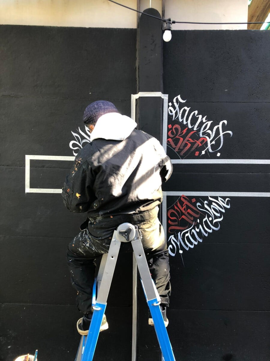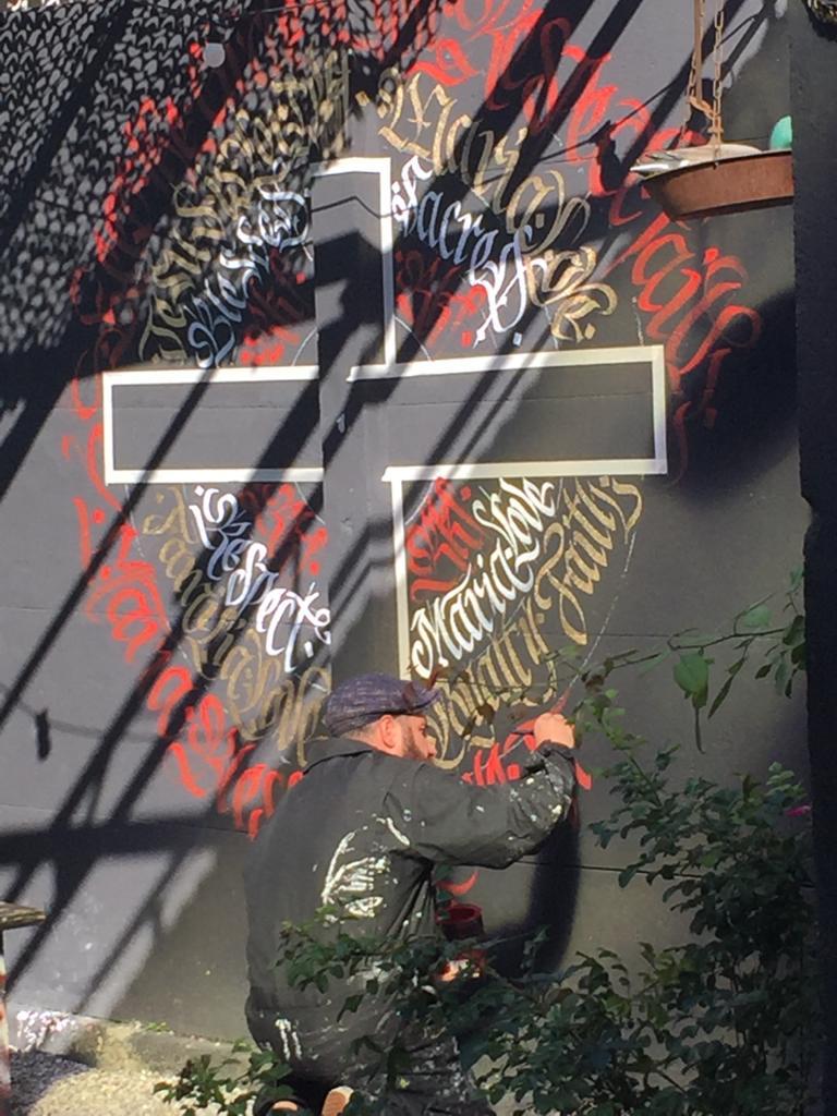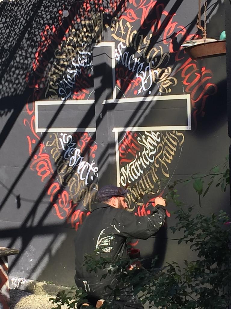 Decorazione calligrafica presso RKF Milano tecnica acrilico per esterno a pennello