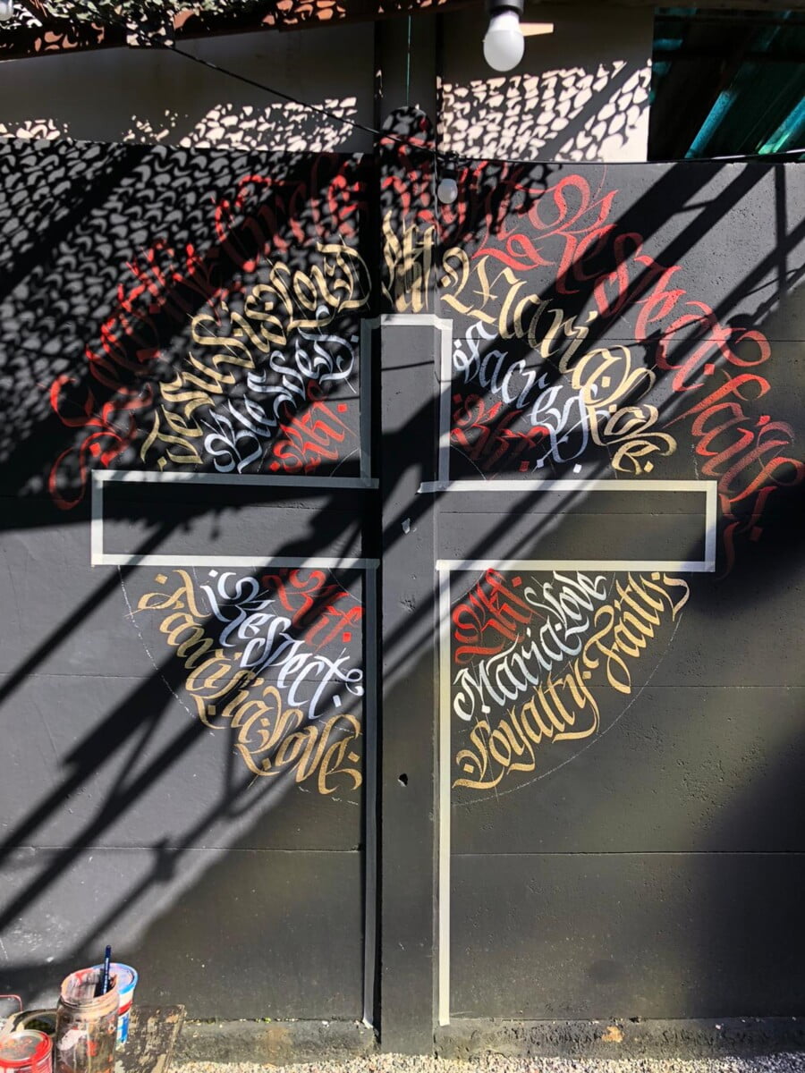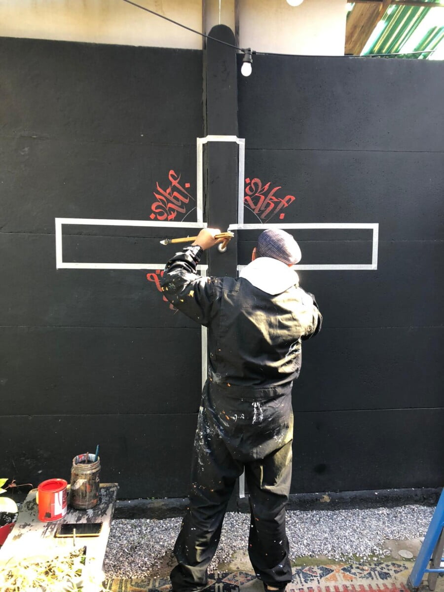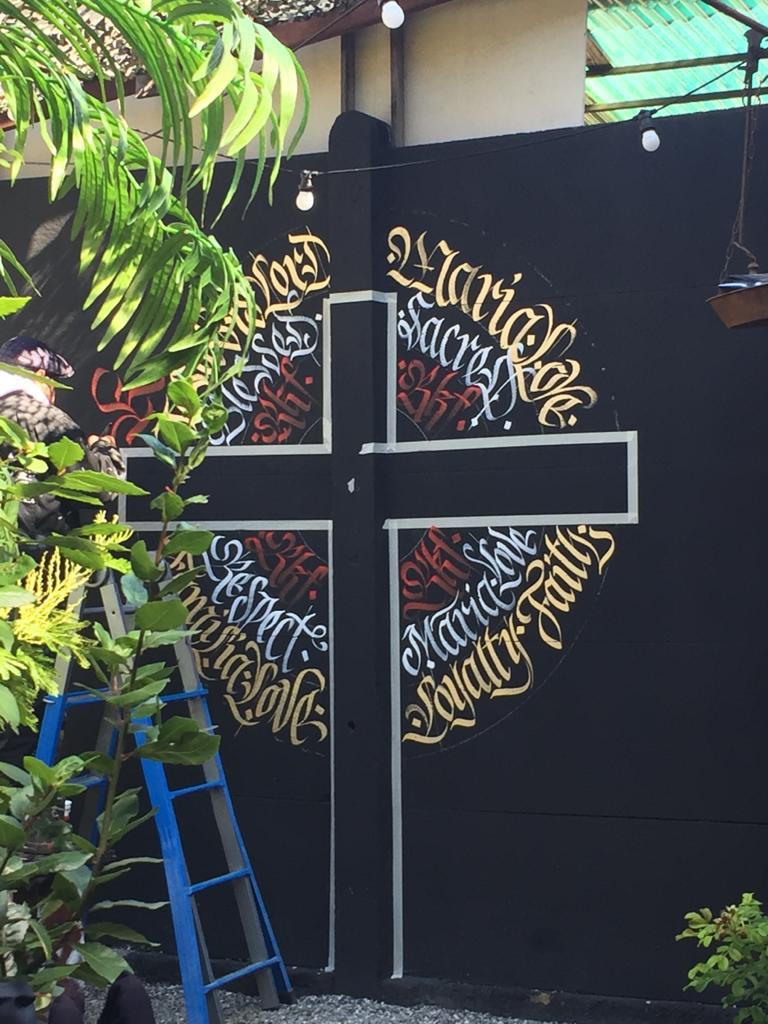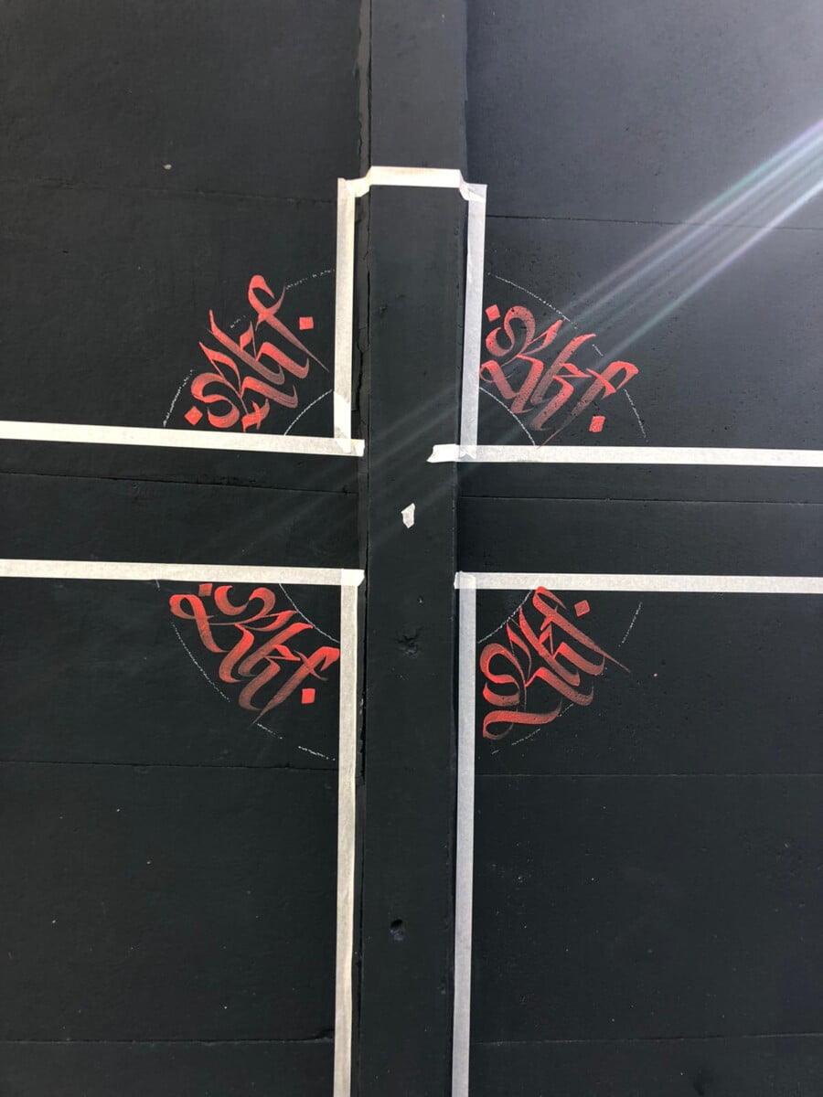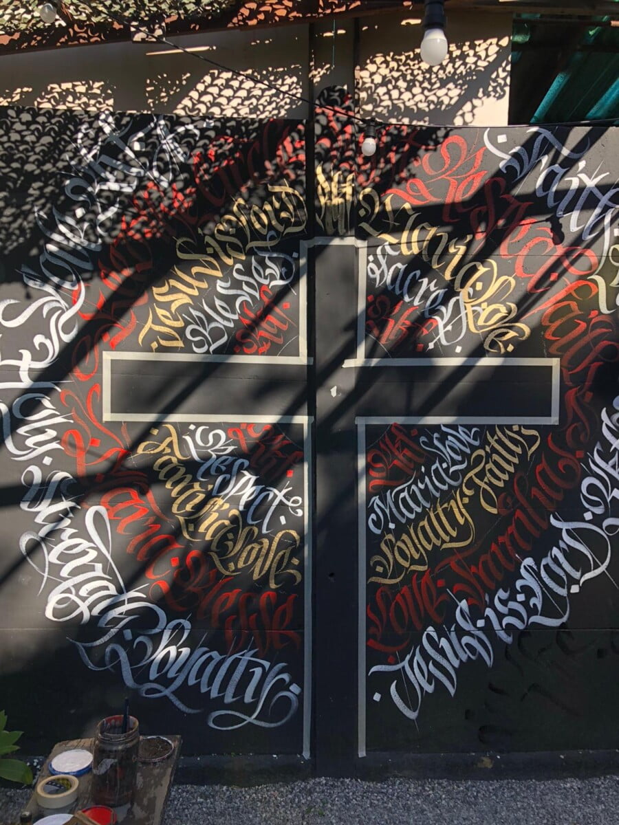 Decorazione calligrafica presso RKF Milano tecnica acrilico per esterno a pennello