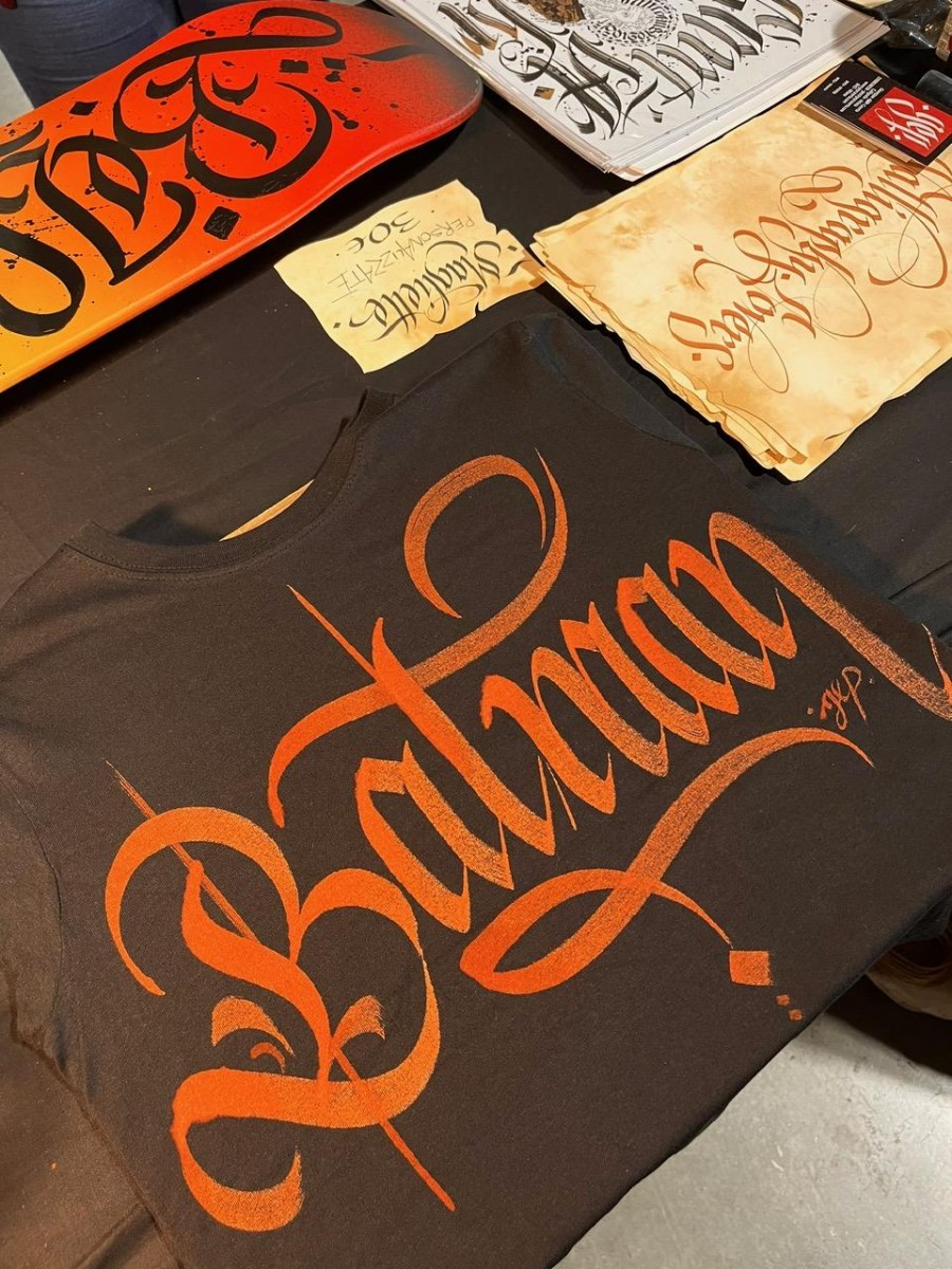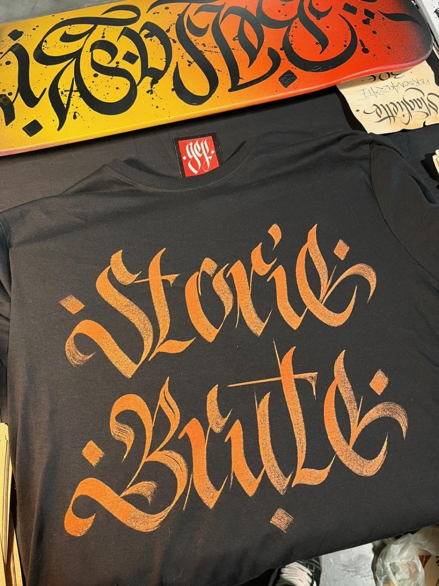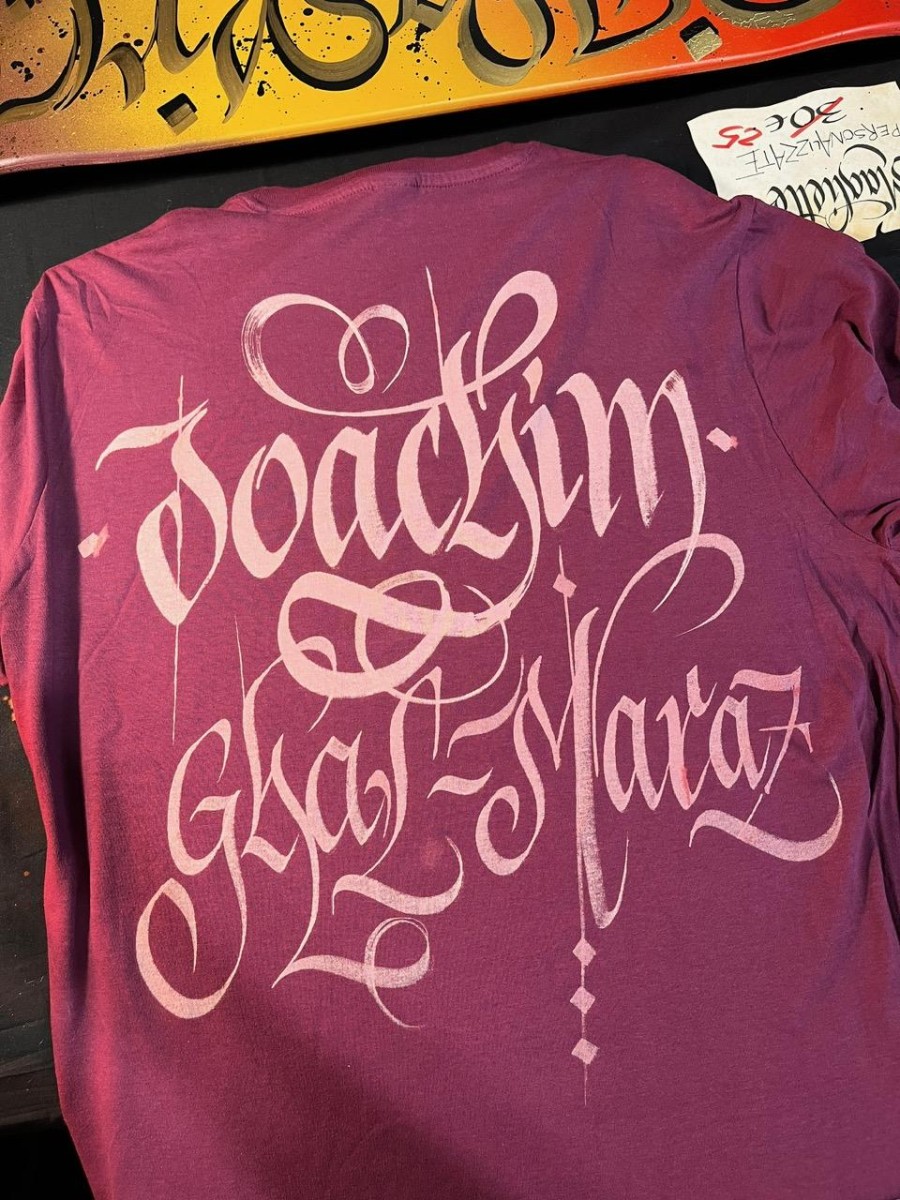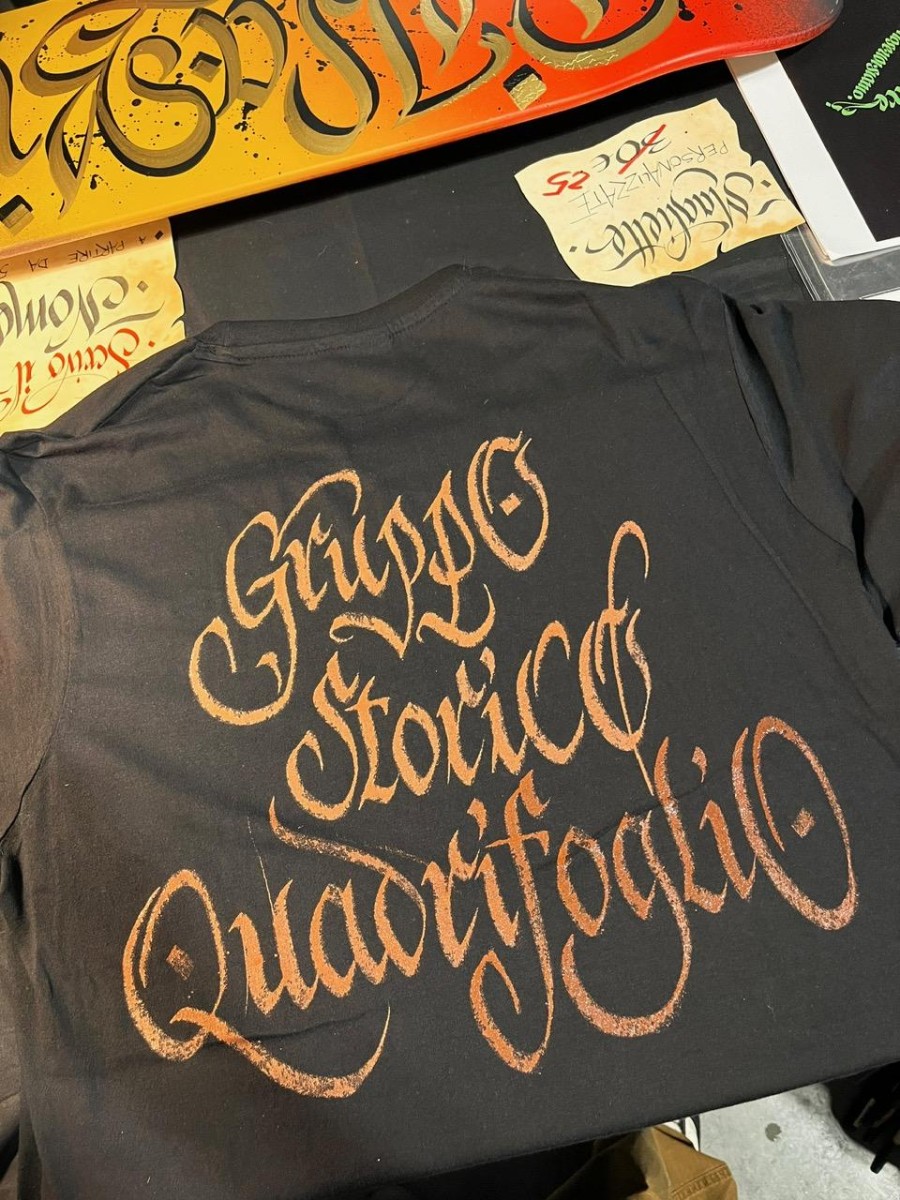 Magliette personalizzate a mano con scritte calligrafiche.