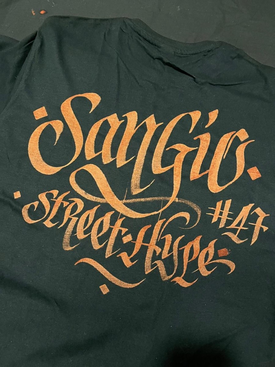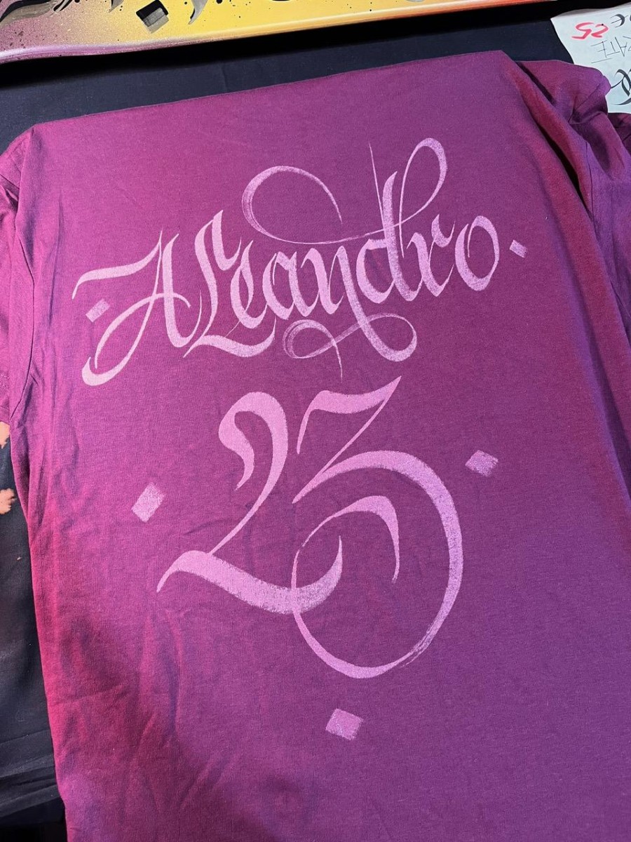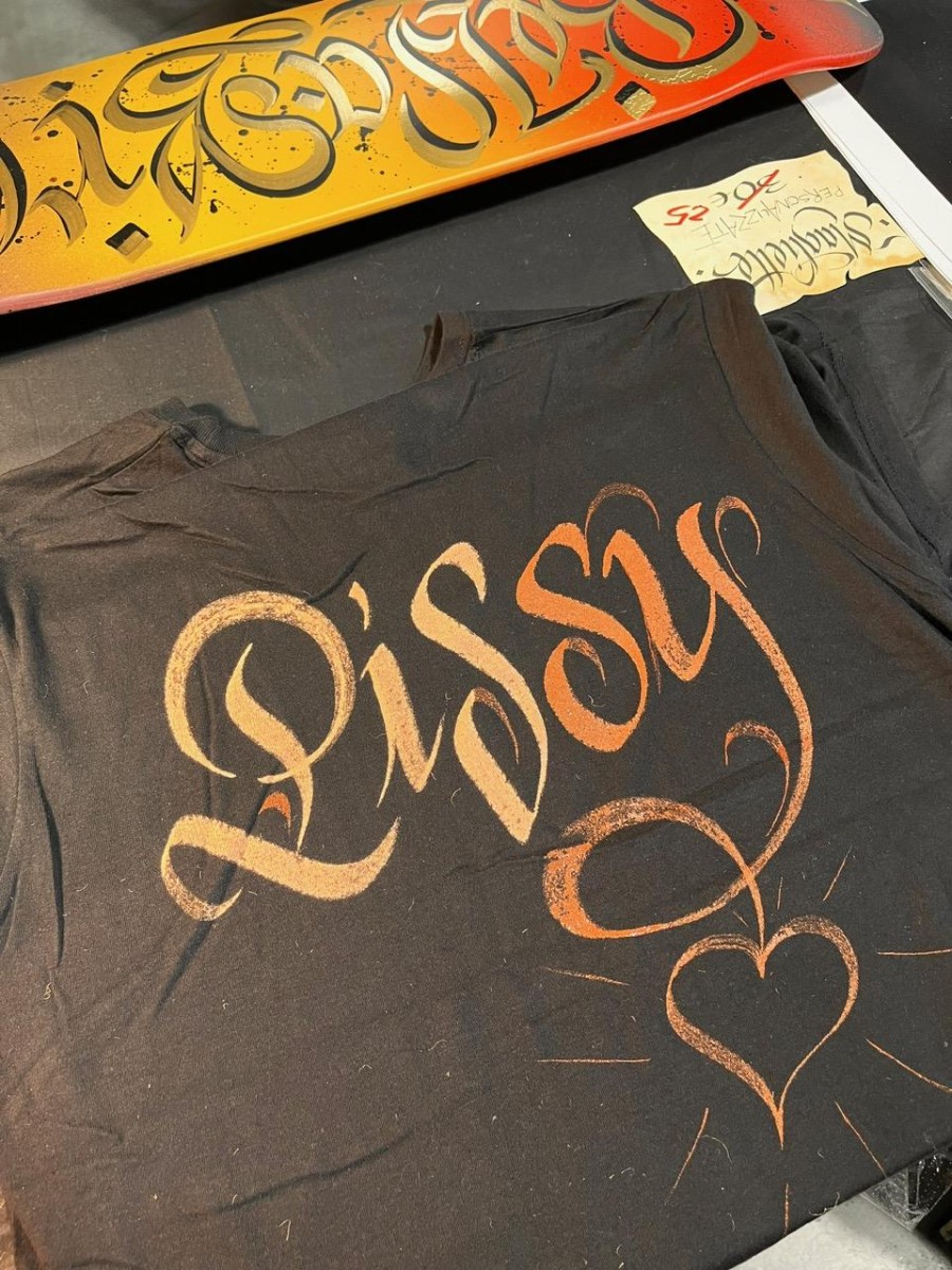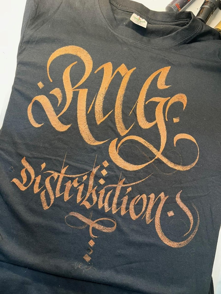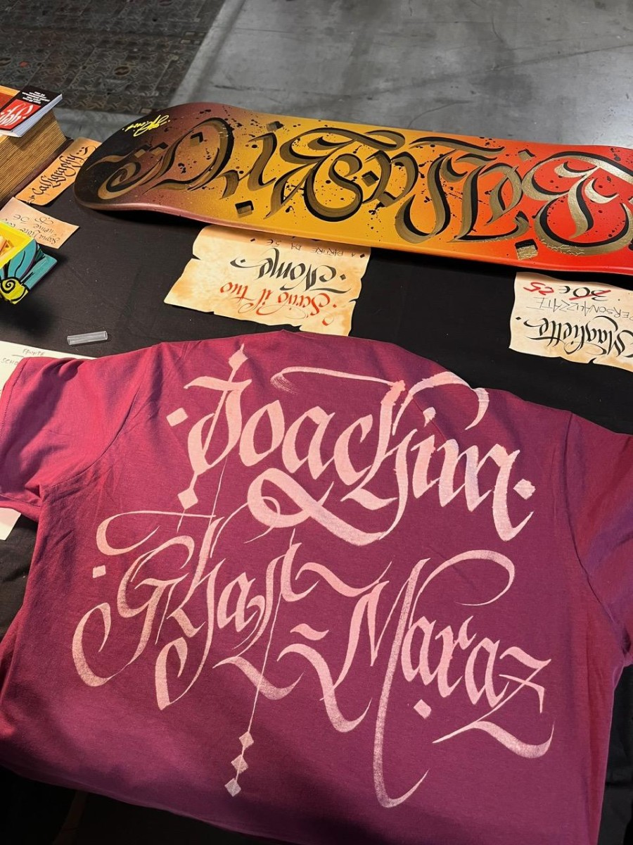 Magliette personalizzate a mano con scritte calligrafiche.