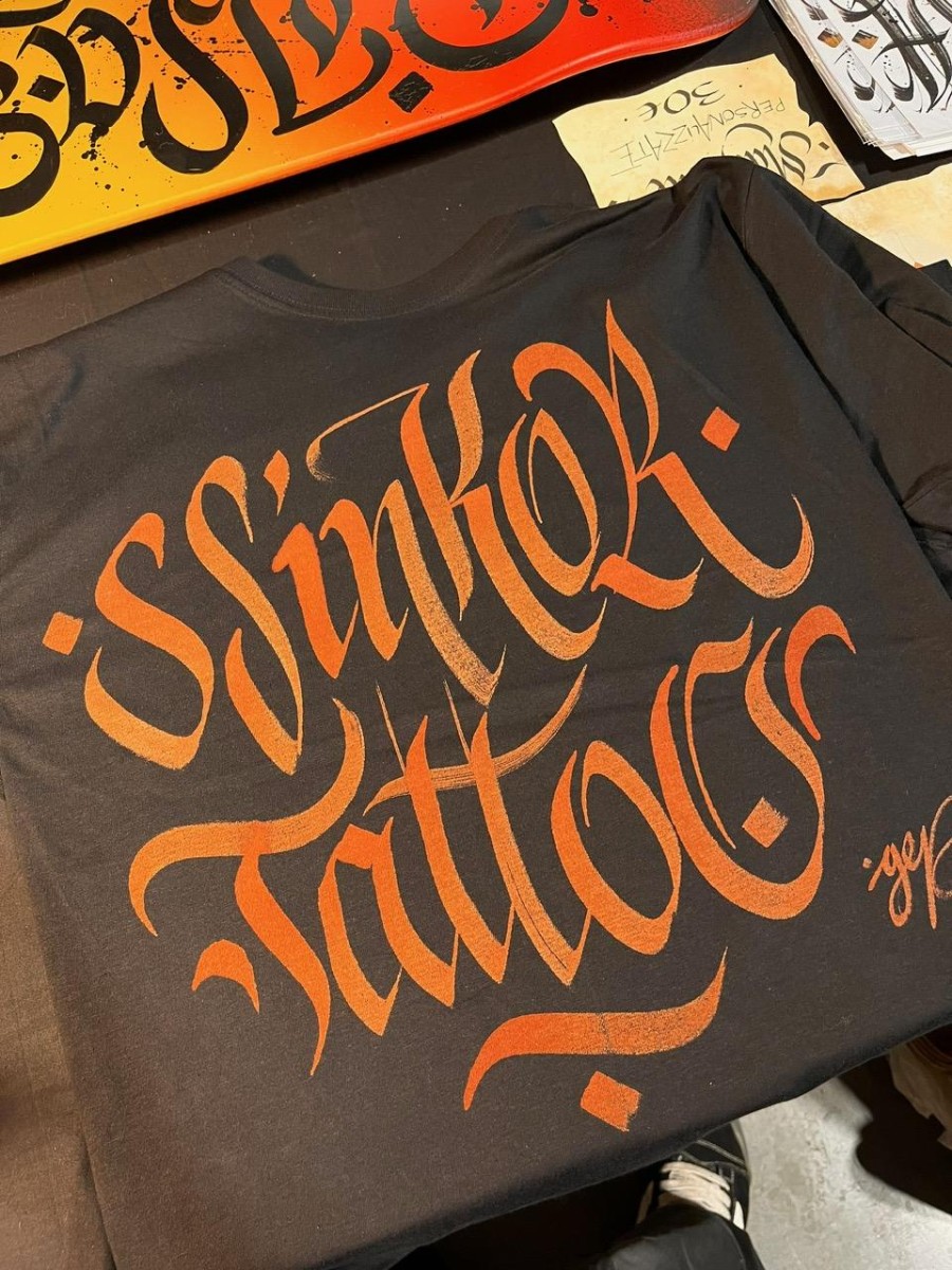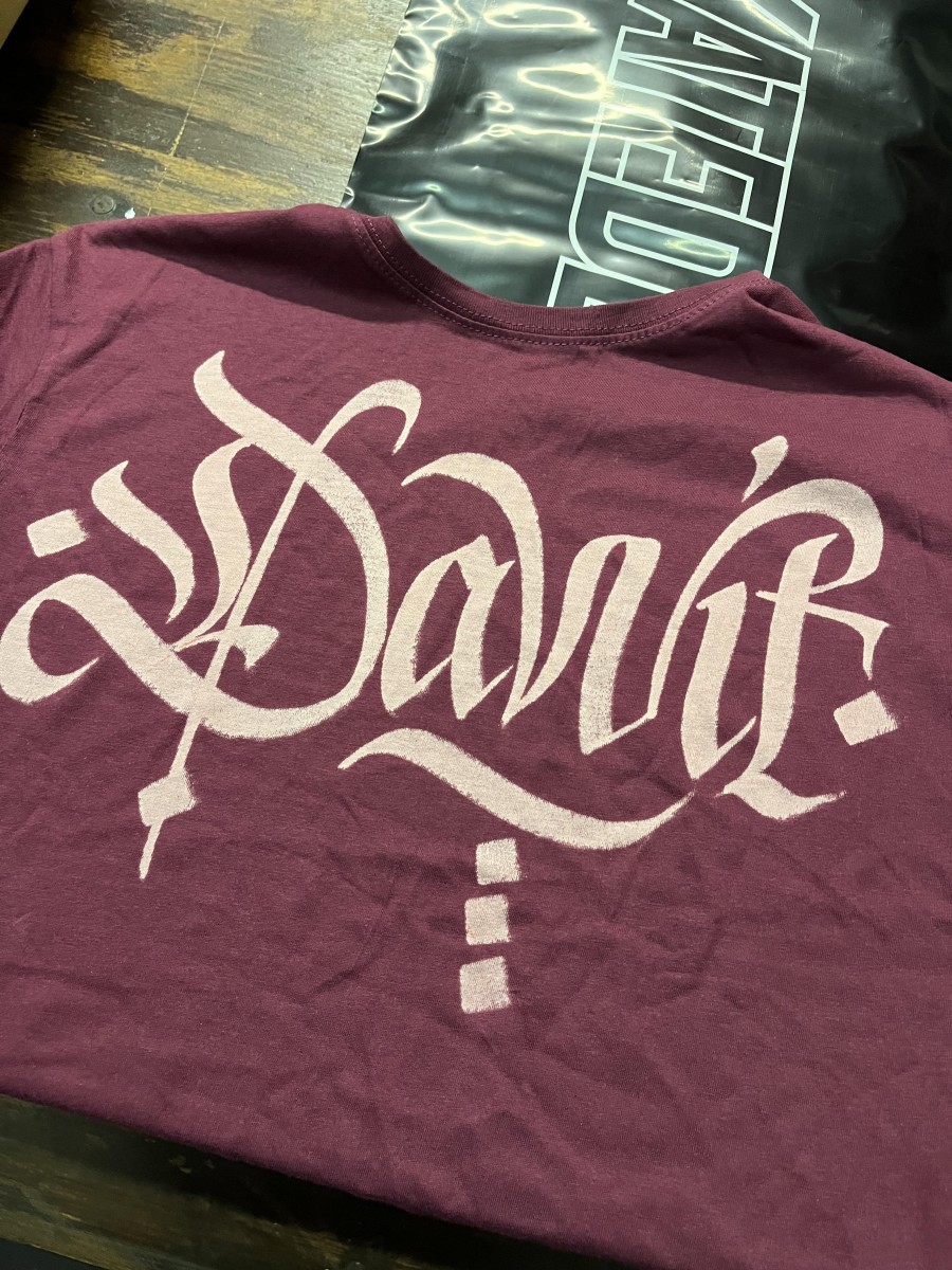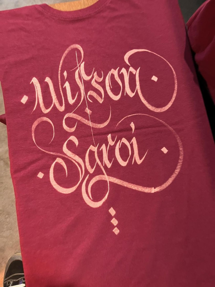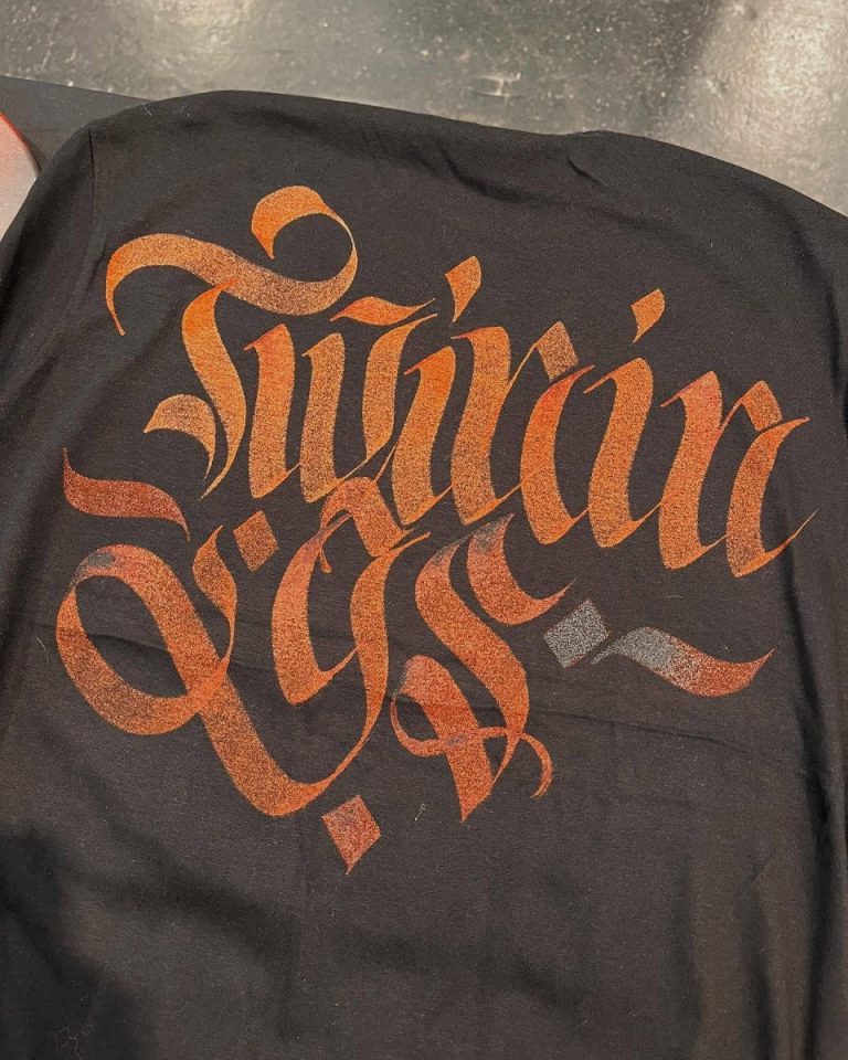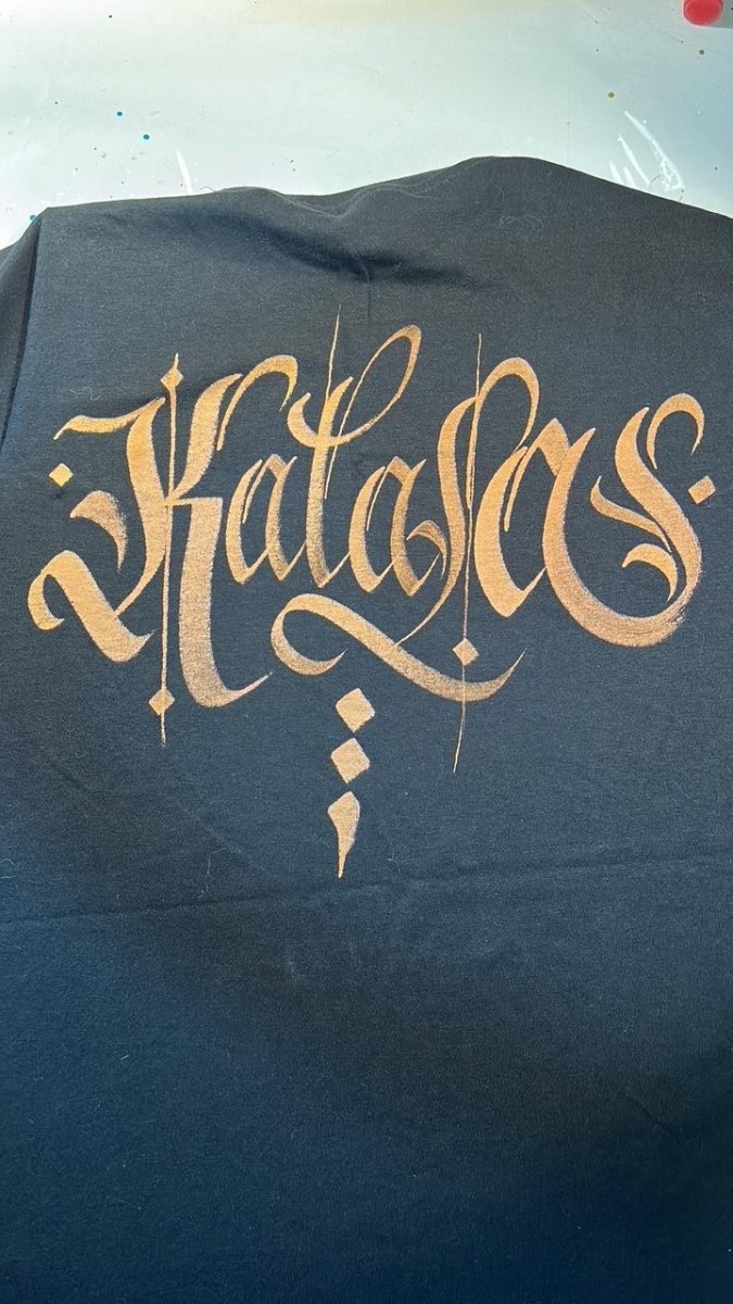 Magliette personalizzate a mano con scritte calligrafiche.