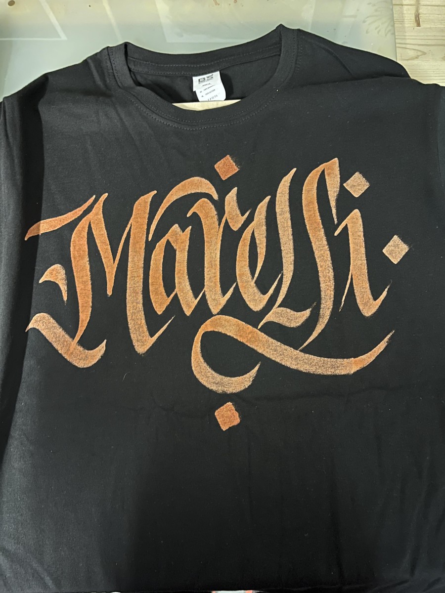 Per realizzare queste magliette ho utilizzato la candeggina a pennello con la mia ARTE , la calligrafia .Il risultato e’ di una maglietta unica inimitabile e soltanto tua.Se vuoi anche tu una maglietta, una felpa o un tuo capo d’abbigliamento rendendolo unico non esitare a scrivermi e realizzeremo insieme un pezzo d’arte da portare in giro per il mondo.