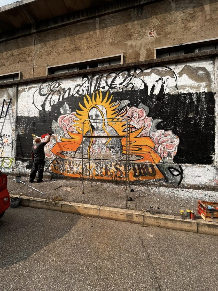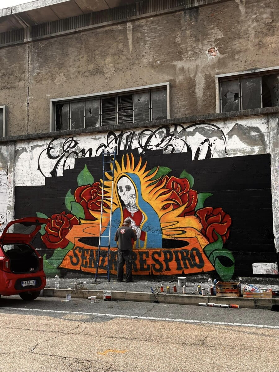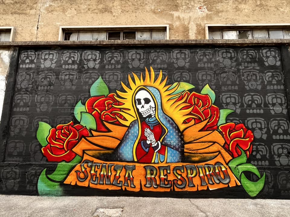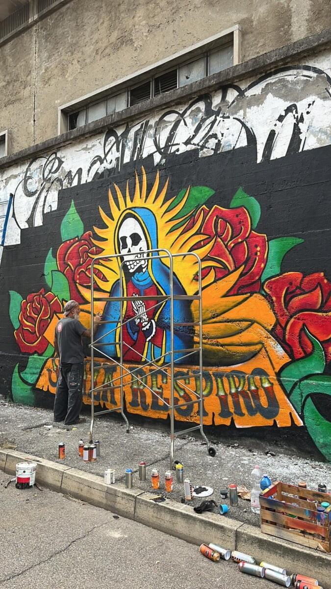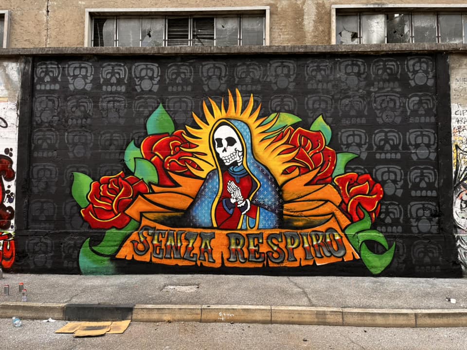 Ne parlo da esterno ma sono una delle voci degli ENMICASA, ma siccome per me quello é passato , parlo invece del restauro della Santa Muerte , il lavoro originale come ho detto era stato realizzato 16 anni fa da me da Gnollo e da Dem , questa volta ho chiamato solo Gnollo e in due giornate siamo riusciti a fare tutto il bellissimo lavoro che potete vedere nelle foto , abbiamo usato spray e colori per esterno a pennello, mi piace davvero tanto il risultato è forse piu’ maturo come lavoro ha i colori molto piu’ caldi. E’ chiaramente un lavoro ispirato alla cultura messicana, é’ stato una delle prime volte che “restauravo” un mio lavoro cercando di dargli una nuova luce !!!