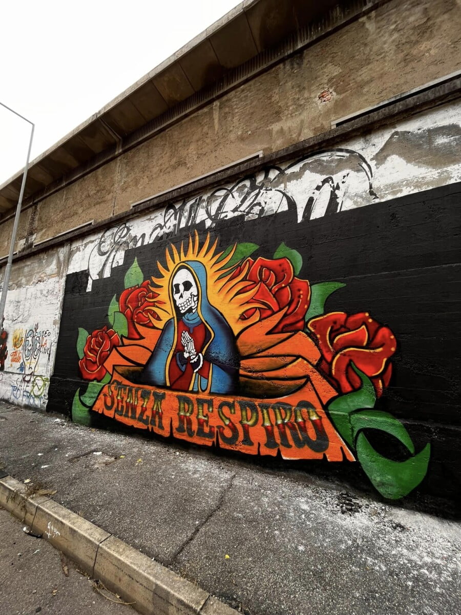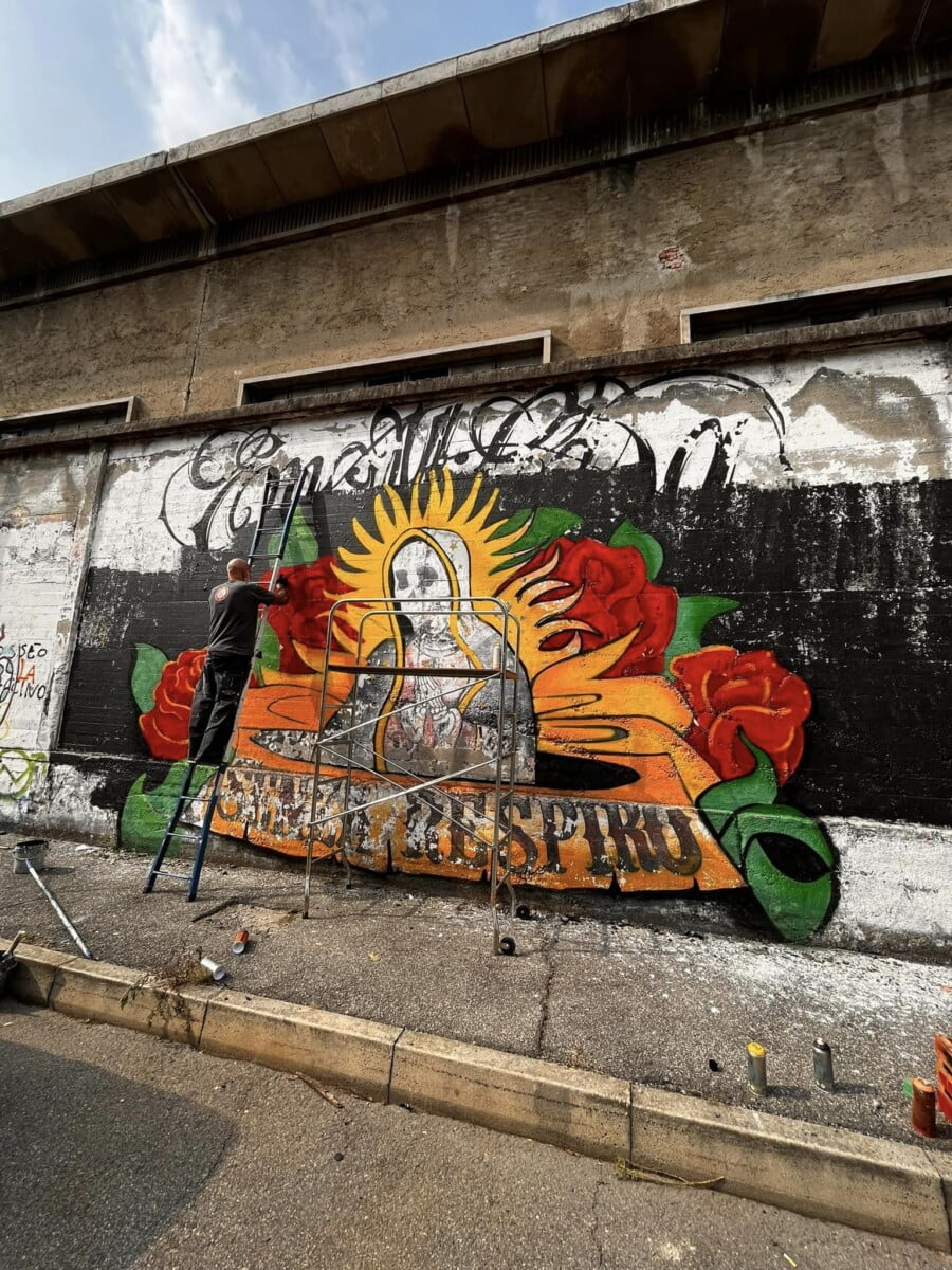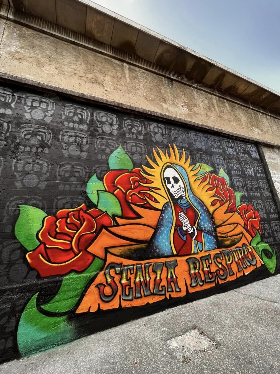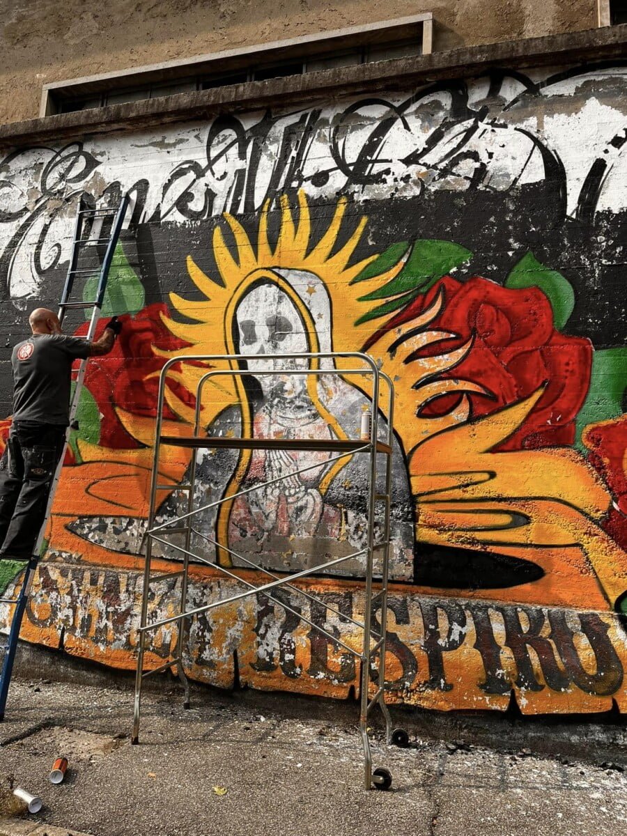 Ne parlo da esterno ma sono una delle voci degli ENMICASA, ma siccome per me quello é passato , parlo invece del restauro della Santa Muerte , il lavoro originale come ho detto era stato realizzato 16 anni fa da me da Gnollo e da Dem , questa volta ho chiamato solo Gnollo e in due giornate siamo riusciti a fare tutto il bellissimo lavoro che potete vedere nelle foto , abbiamo usato spray e colori per esterno a pennello, mi piace davvero tanto il risultato è forse piu’ maturo come lavoro ha i colori molto piu’ caldi. E’ chiaramente un lavoro ispirato alla cultura messicana, é’ stato una delle prime volte che “restauravo” un mio lavoro cercando di dargli una nuova luce !!!