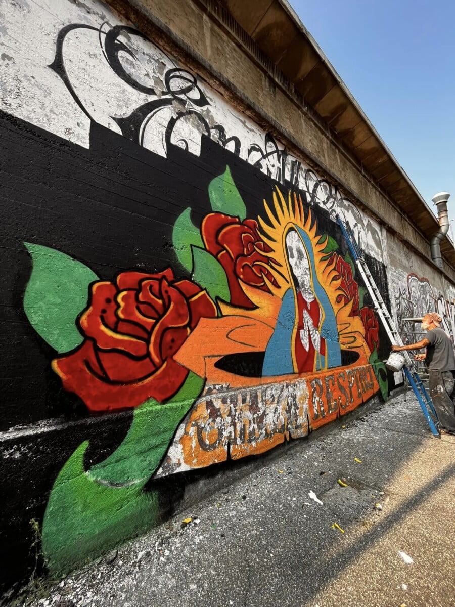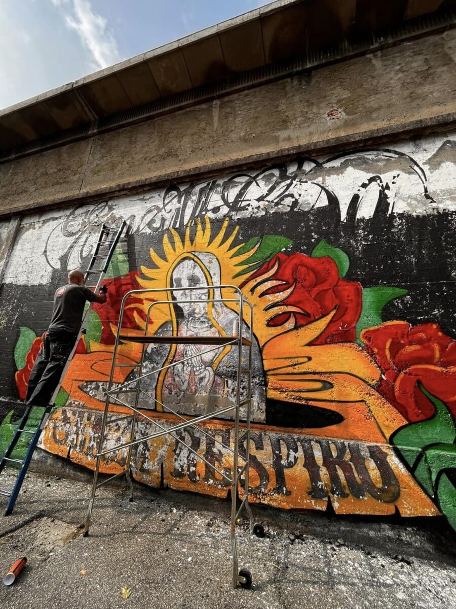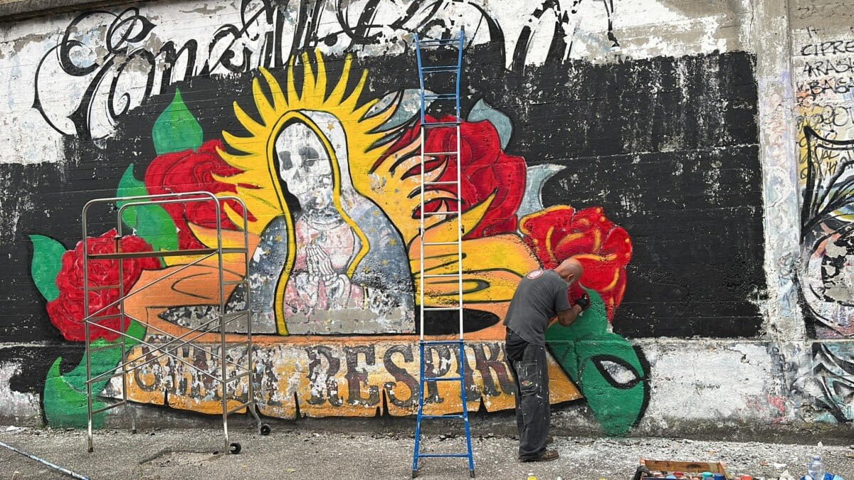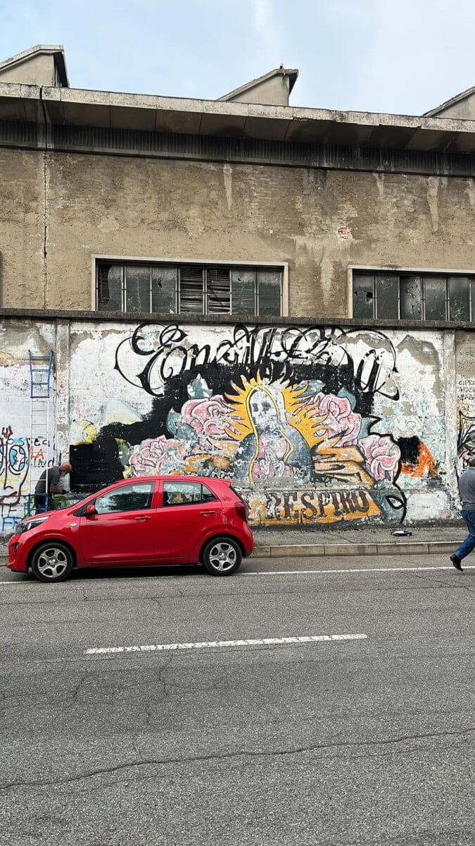 Ne parlo da esterno ma sono una delle voci degli ENMICASA, ma siccome per me quello é passato , parlo invece del restauro della Santa Muerte , il lavoro originale come ho detto era stato realizzato 16 anni fa da me da Gnollo e da Dem , questa volta ho chiamato solo Gnollo e in due giornate siamo riusciti a fare tutto il bellissimo lavoro che potete vedere nelle foto , abbiamo usato spray e colori per esterno a pennello, mi piace davvero tanto il risultato è forse piu’ maturo come lavoro ha i colori molto piu’ caldi. E’ chiaramente un lavoro ispirato alla cultura messicana, é’ stato una delle prime volte che “restauravo” un mio lavoro cercando di dargli una nuova luce !!!