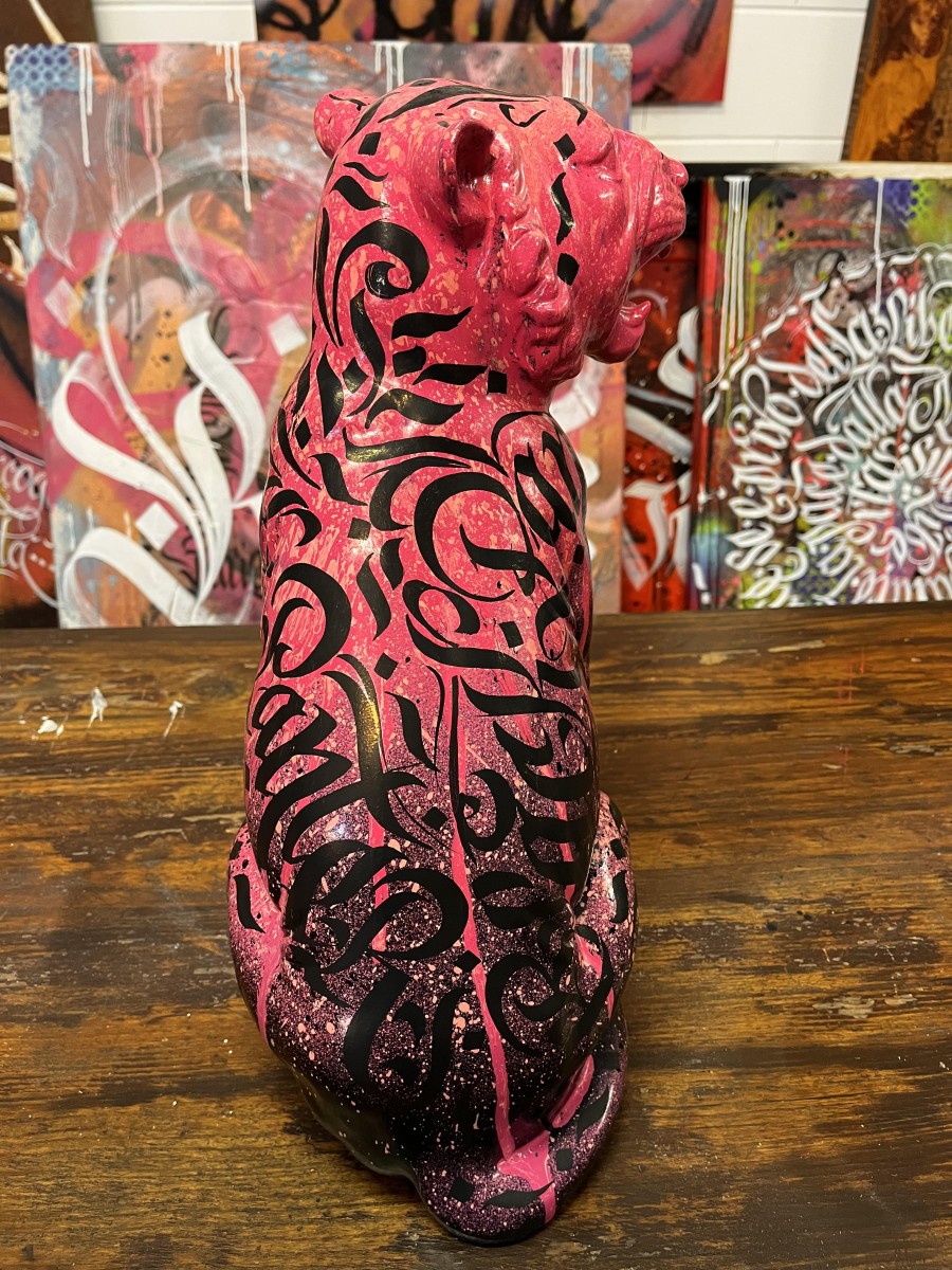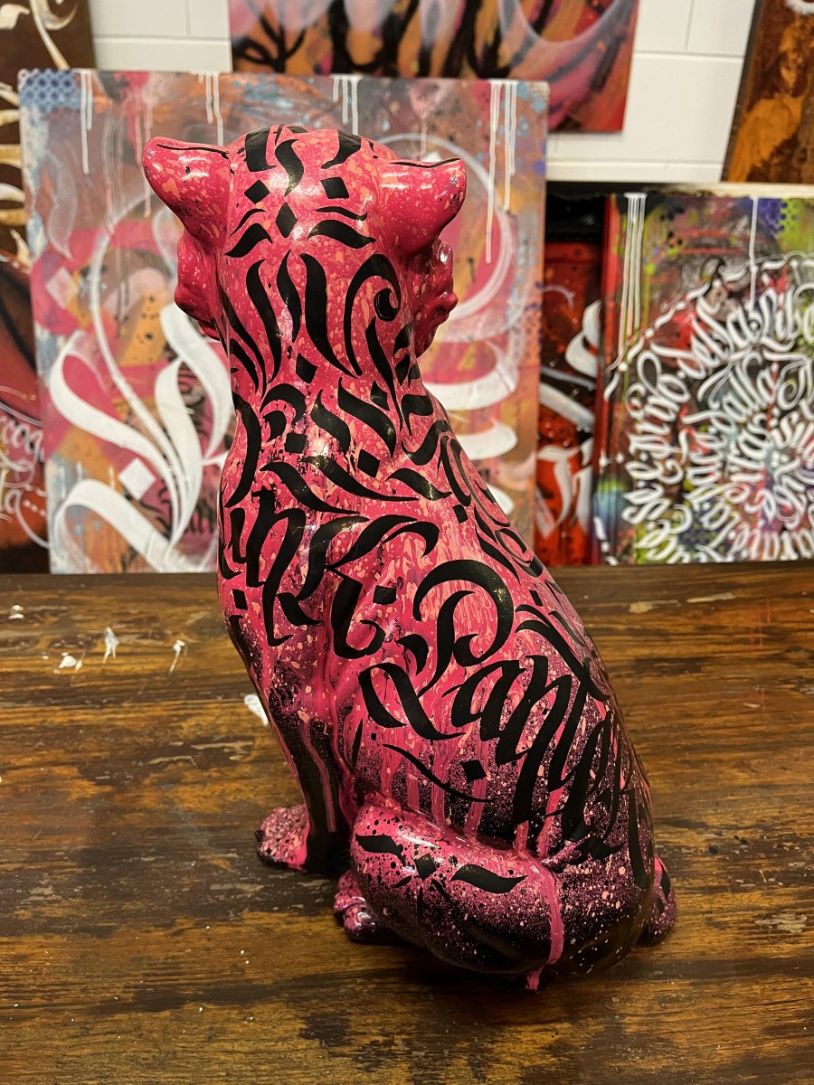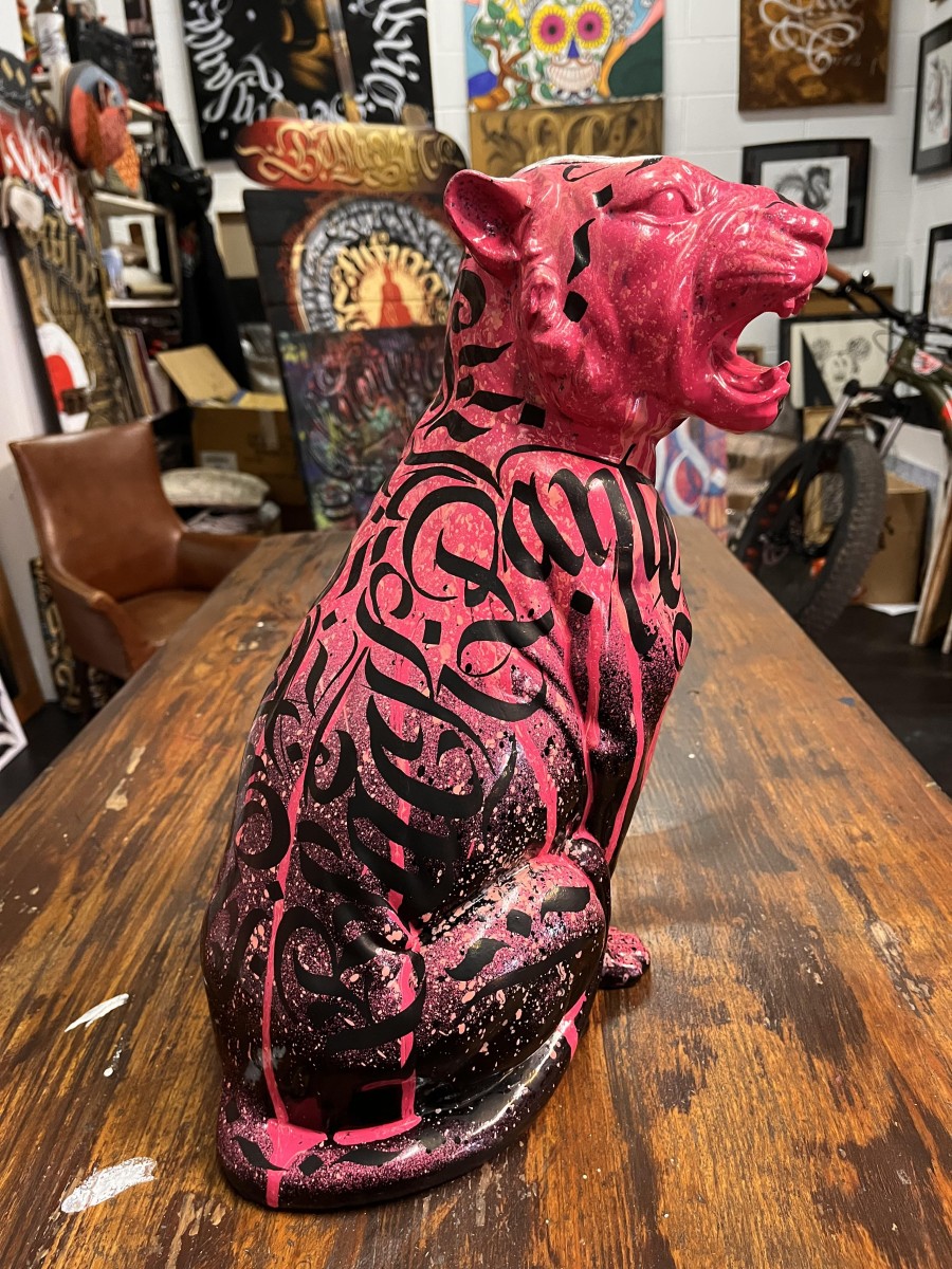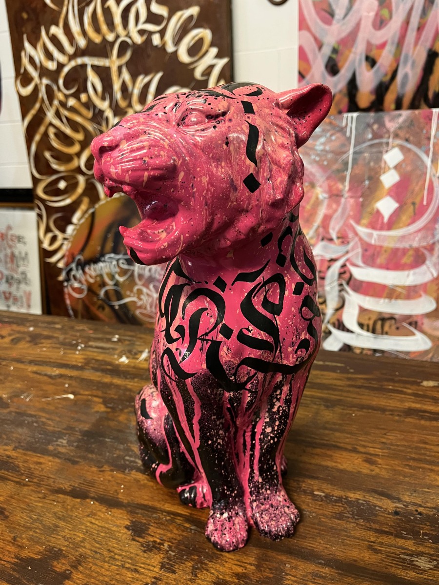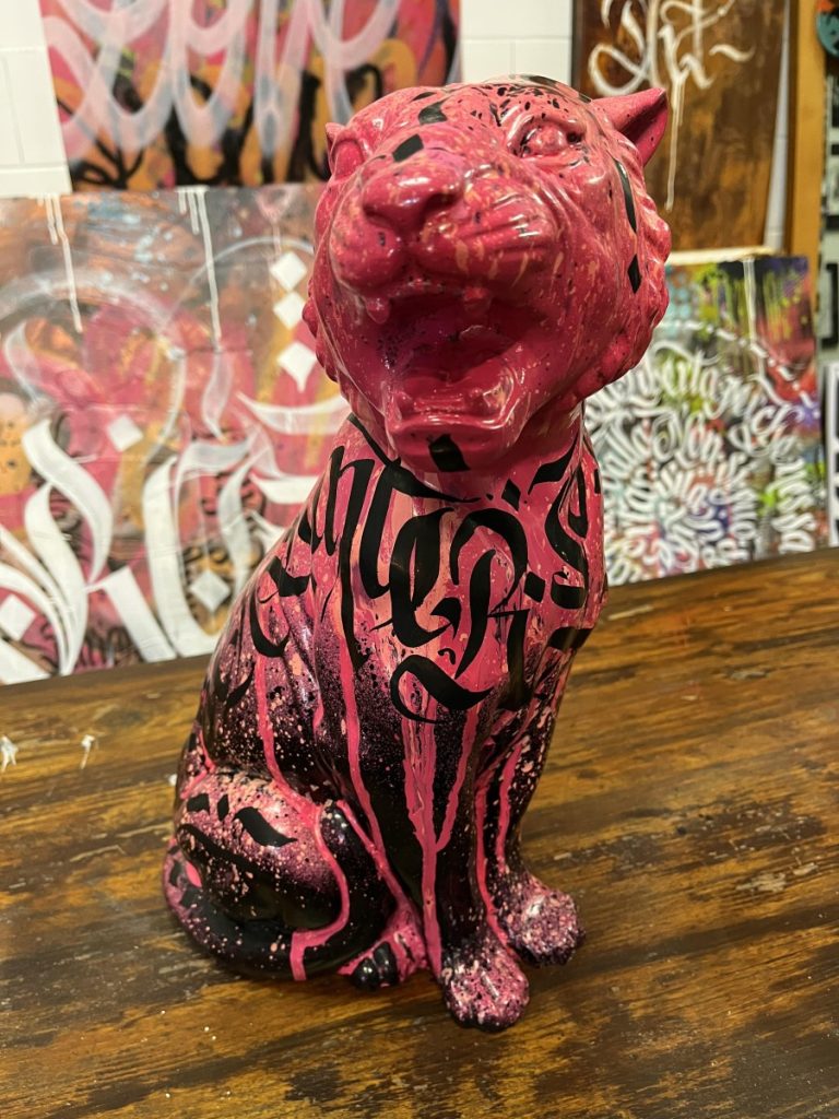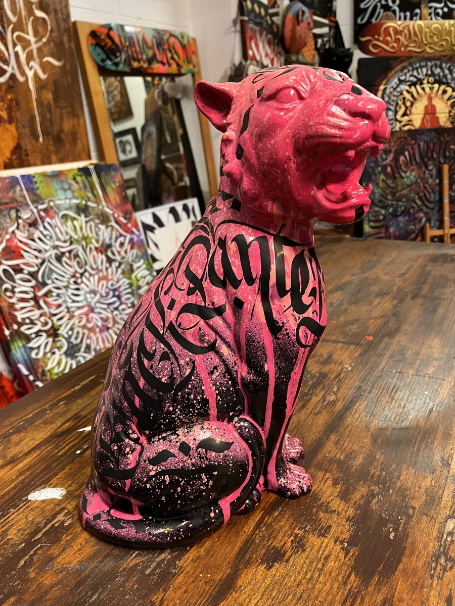 La particolarità di questa pantera è la presenza di una scritta nera, calligrafica, che le attraversa il petto e parte del collo. La scritta sembra quasi un graffito o un tatuaggio, aggiungendo un elemento di design moderno eStreet-style all’opera. le scritte calligrafiche rappresentano i colori Pink Panther – Black Panther
