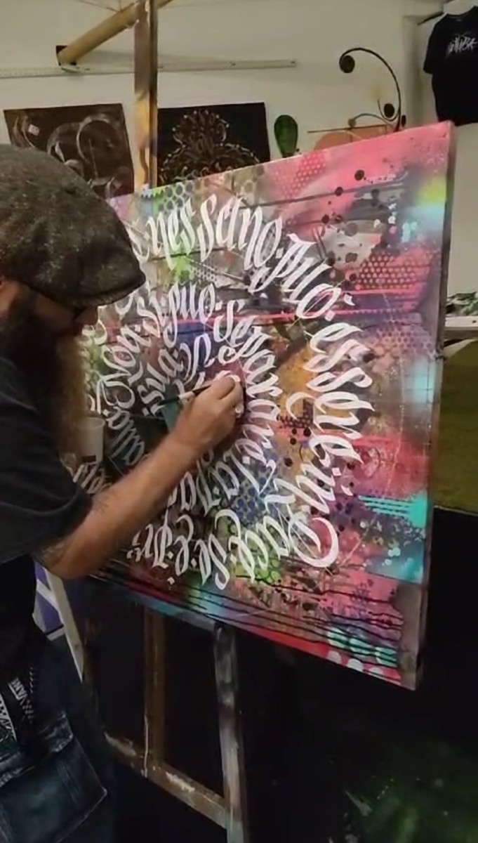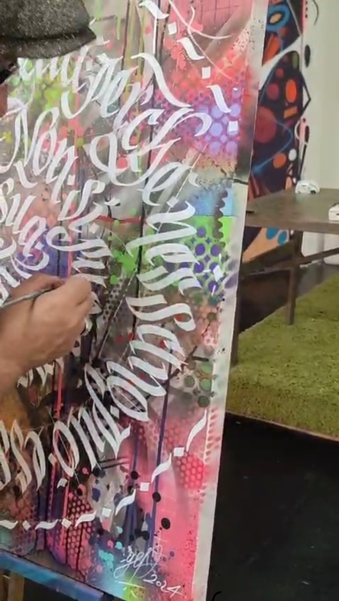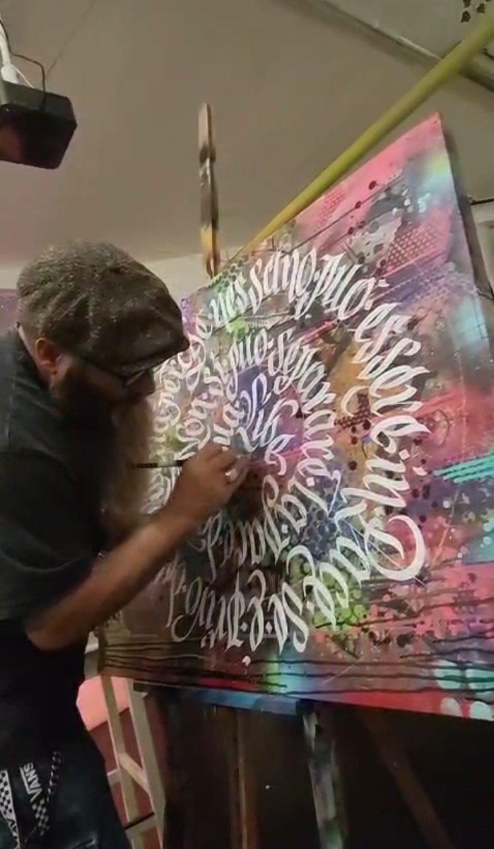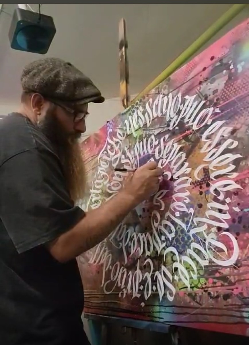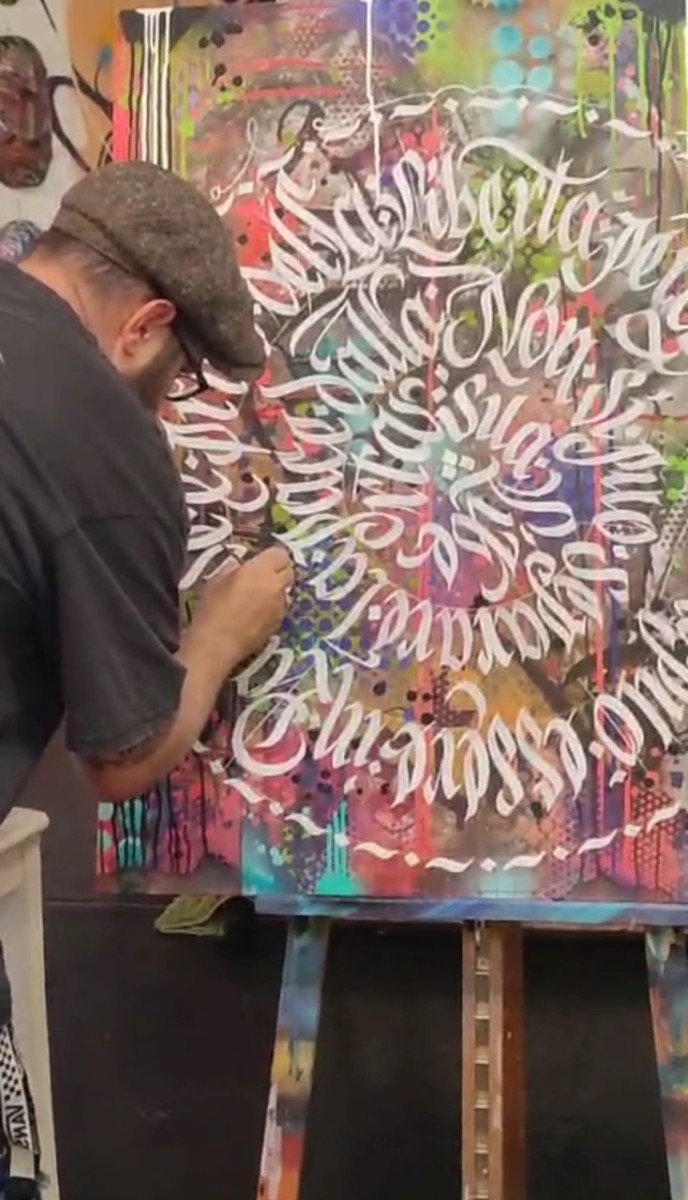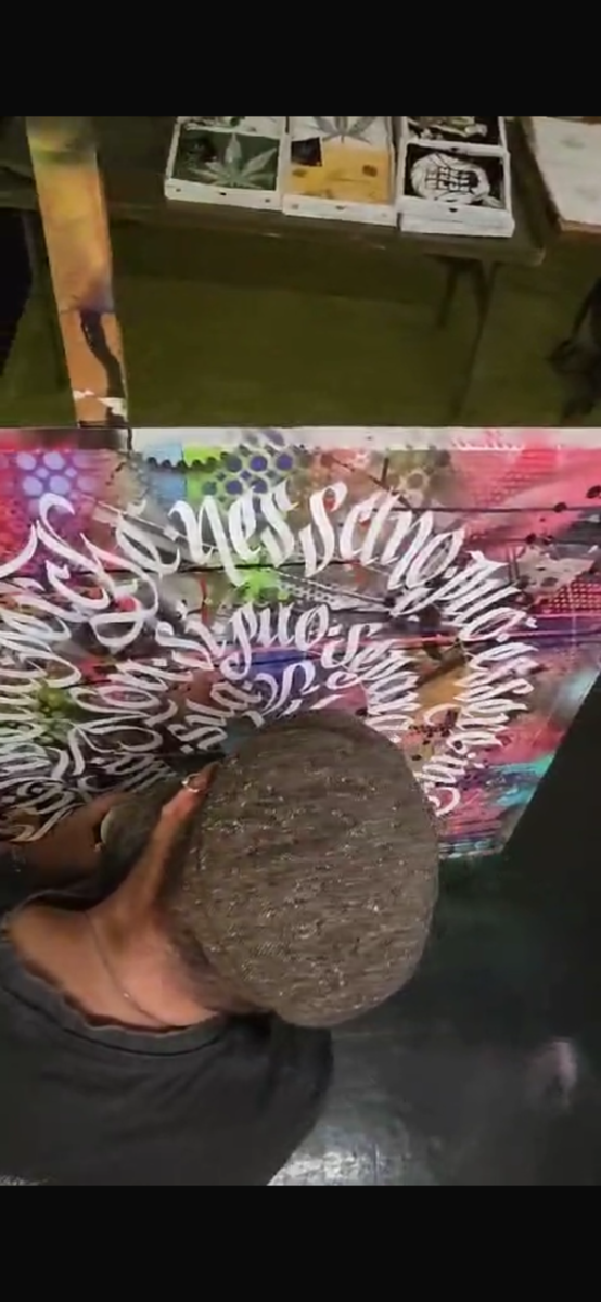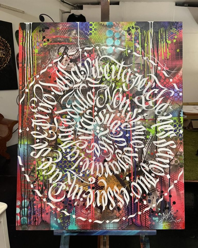 - Al centro dell’opera si trova un cerchio con una scritta calligrafica intricata. La calligrafia e’ l’elemento centrale, con le parole che si sviluppano in una spirale all’interno del cerchio. Lo stile della scrittura suggerisce un mix di calligrafia tradizionale e lettering moderno, tipico del writing e della street art o dei calligraffiti.