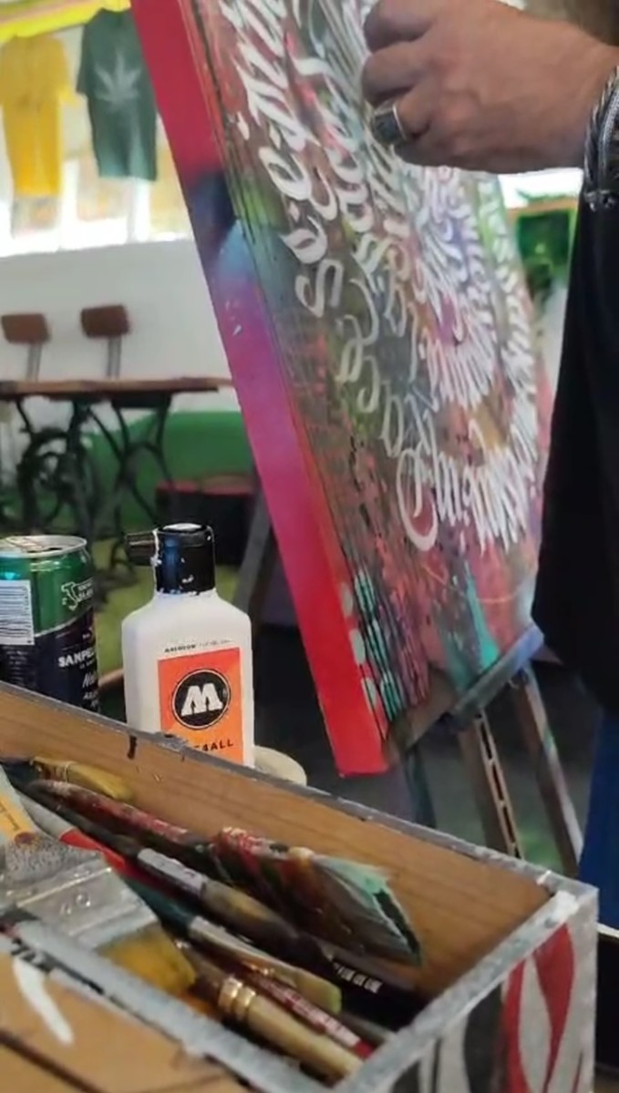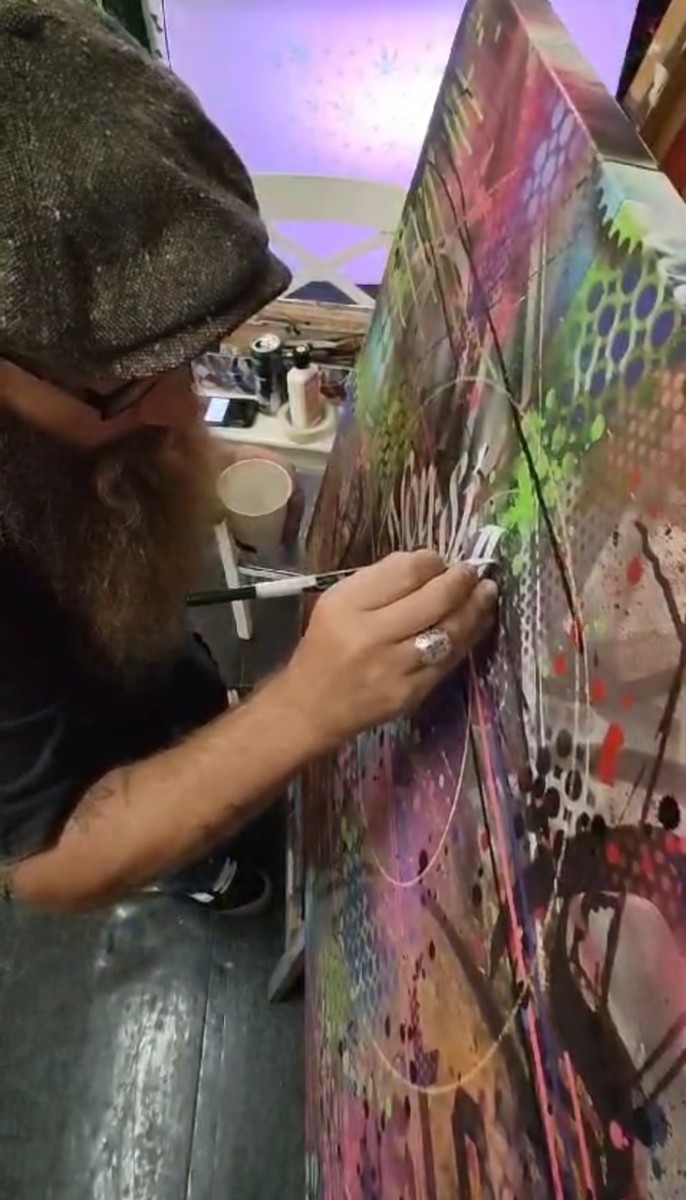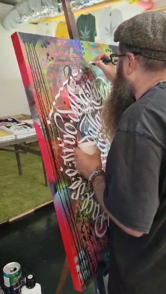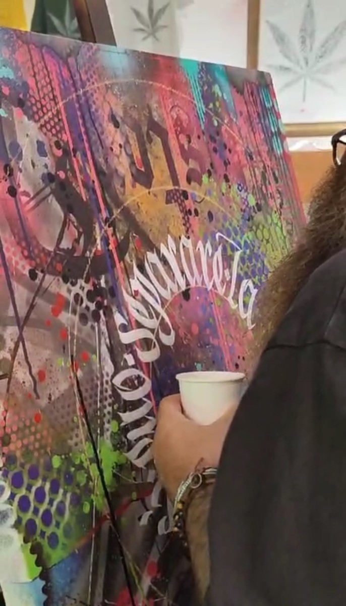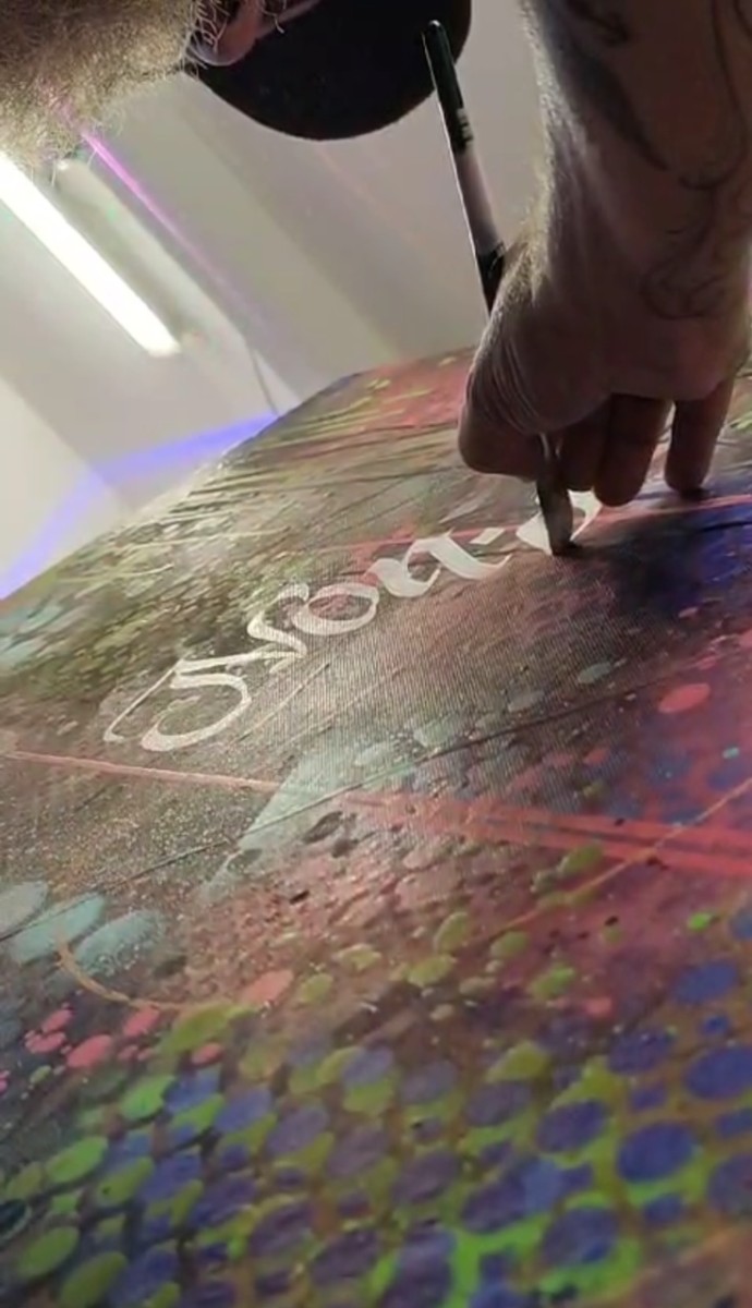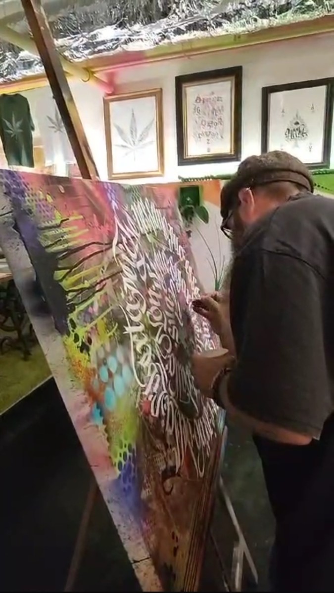 - Al centro dell’opera si trova un cerchio con una scritta calligrafica intricata. La calligrafia e’ l’elemento centrale, con le parole che si sviluppano in una spirale all’interno del cerchio. Lo stile della scrittura suggerisce un mix di calligrafia tradizionale e lettering moderno, tipico del writing e della street art o dei calligraffiti.