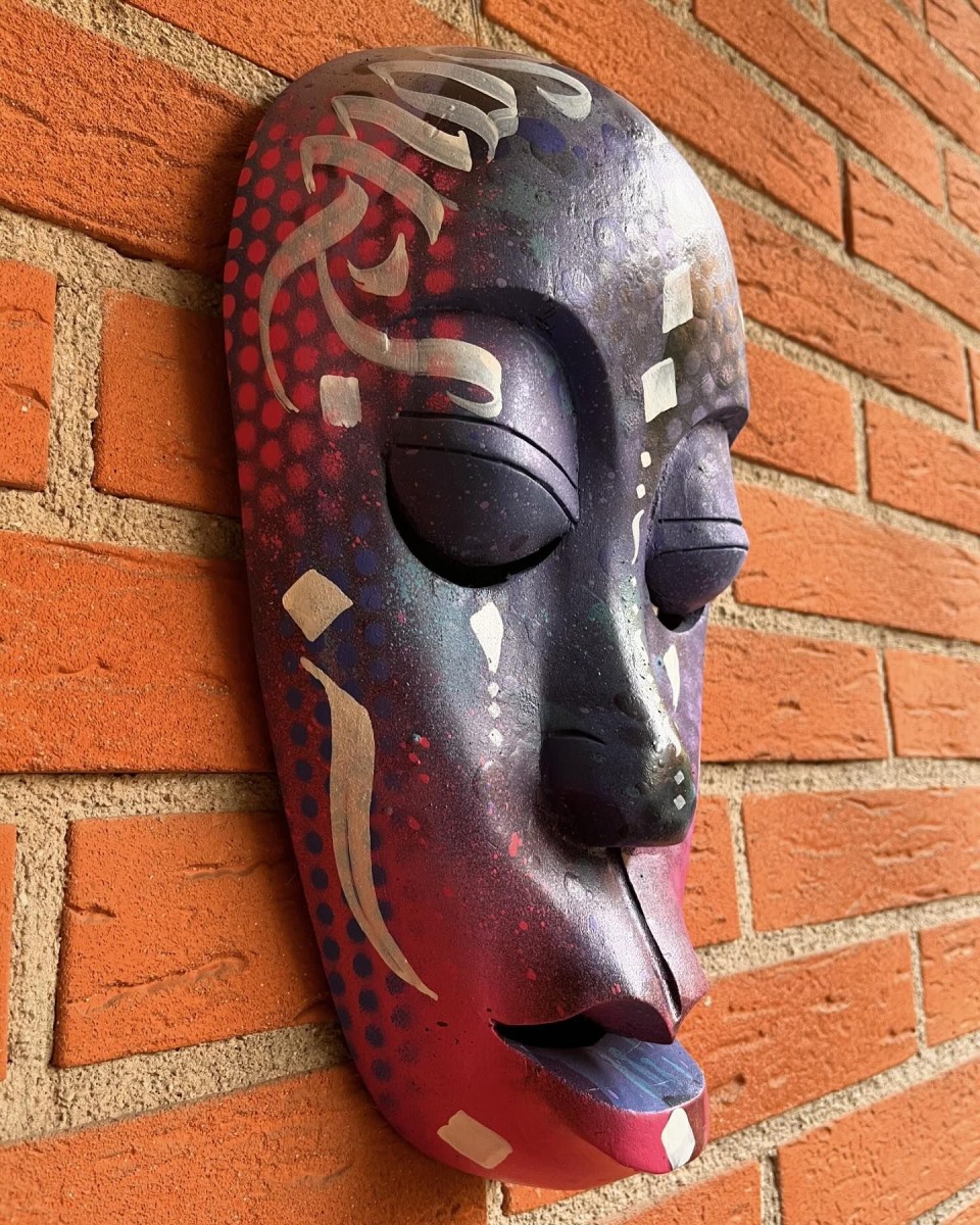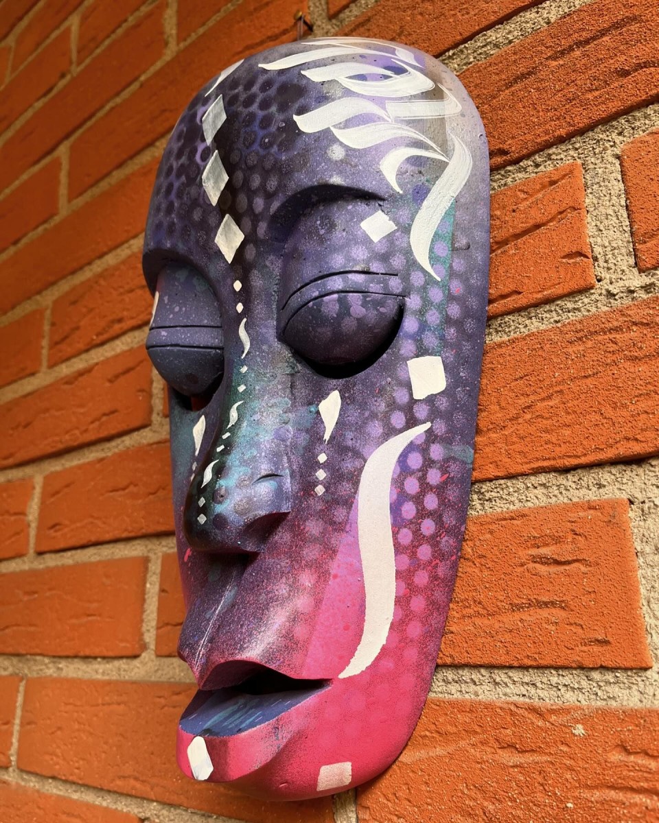 tecnica mista con bombolette a spray e calligrafia a pennello con finitura trasparente per proteggerla nel tempo.